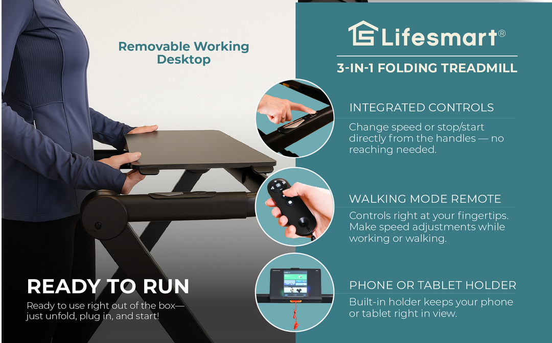 Elevate your daily routine with the Lifesmart® TM2202 3-in-1 Treadmill. Designed for modern lifestyles, this innovative machine blends a treadmill, walking station, and integrated desk—perfect for staying active while working, reading, or relaxing. From light walks to jogs, it adapts to your pace and your goals.