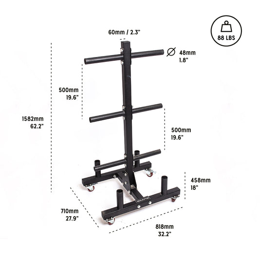 螺栓固定式板釘可在所有立柱層上容納高達 1,740 磅的全尺寸保險槓,四個奧林匹克桿支架使其成為商業和家庭健身房英雄的終極存儲解決方案。